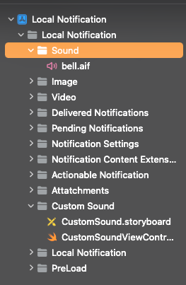 클래스에는 Scene의 Custom Sound 버튼과 연결된 메서드에 Local Notification을 예약하는 코드가 구현되어있다.