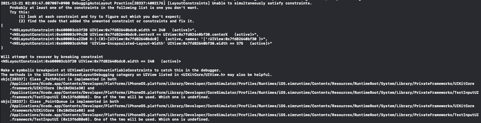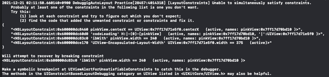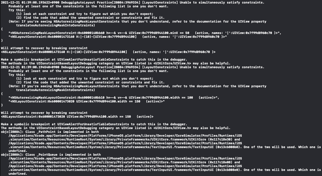 해당 문제는 이전 실습때 처럼 translateAutoresizingMaskIntoConstraint 속성을 비활성화하지 않은 문제다.