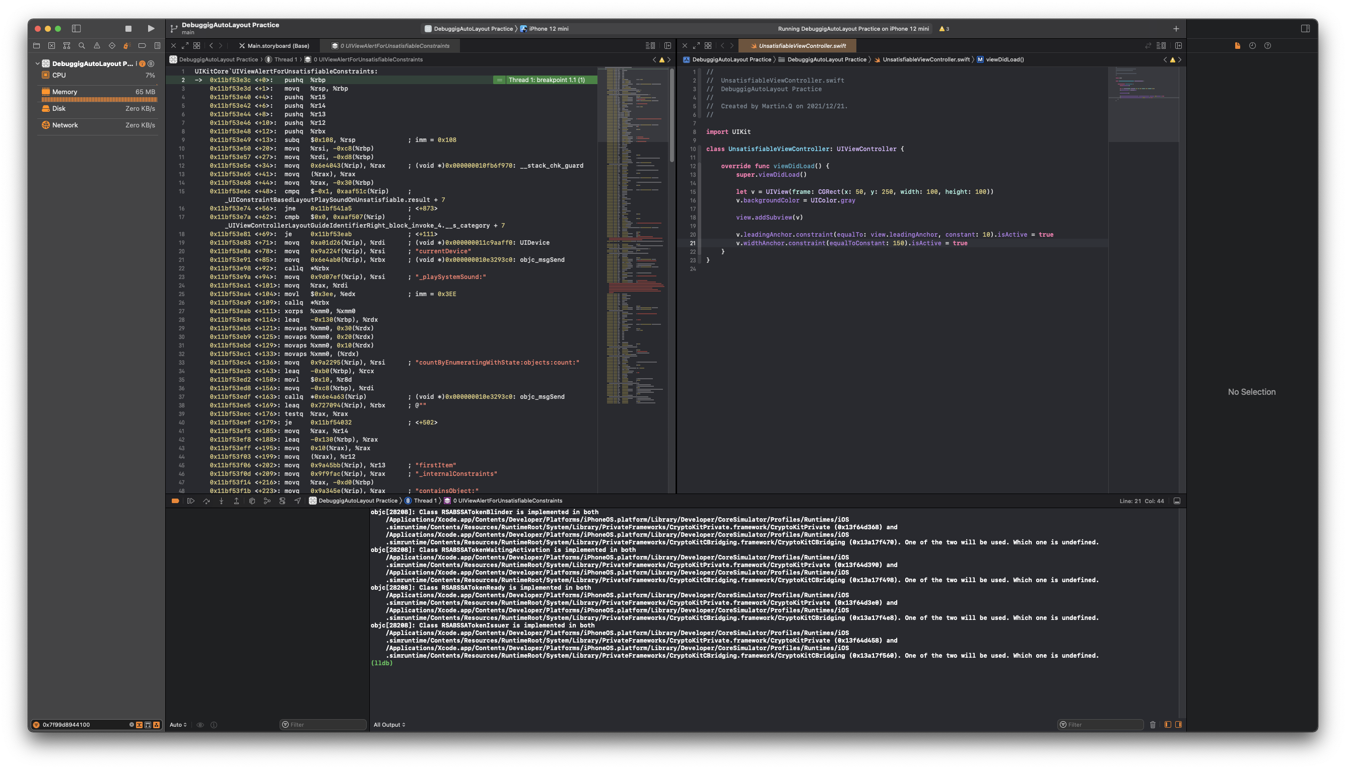Breakpoint로 인해 일시 정지되고, 이상한 코드가 표시됨과 함께 'lldb'라는 내용이 콘솔에 출력된다.
