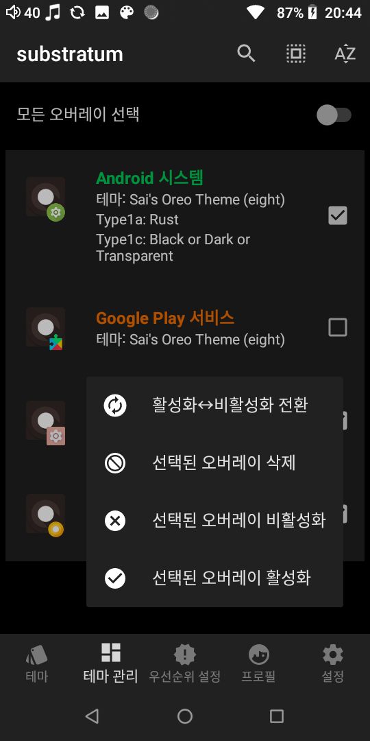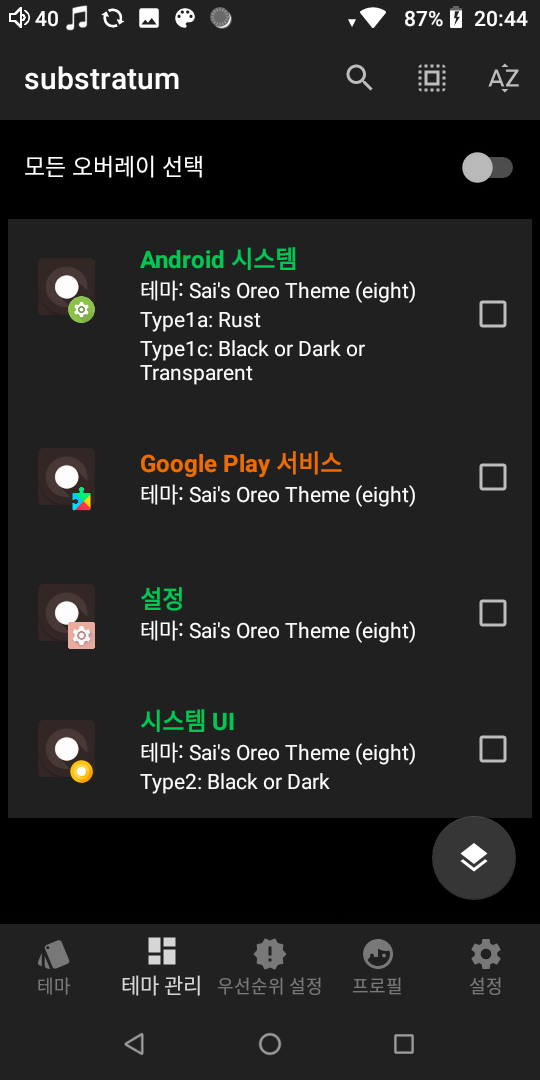 같은 방식으로 설정과 시스템 UI에도 해당 과정을 반복하고, 테마 관리 탭으로 이동해