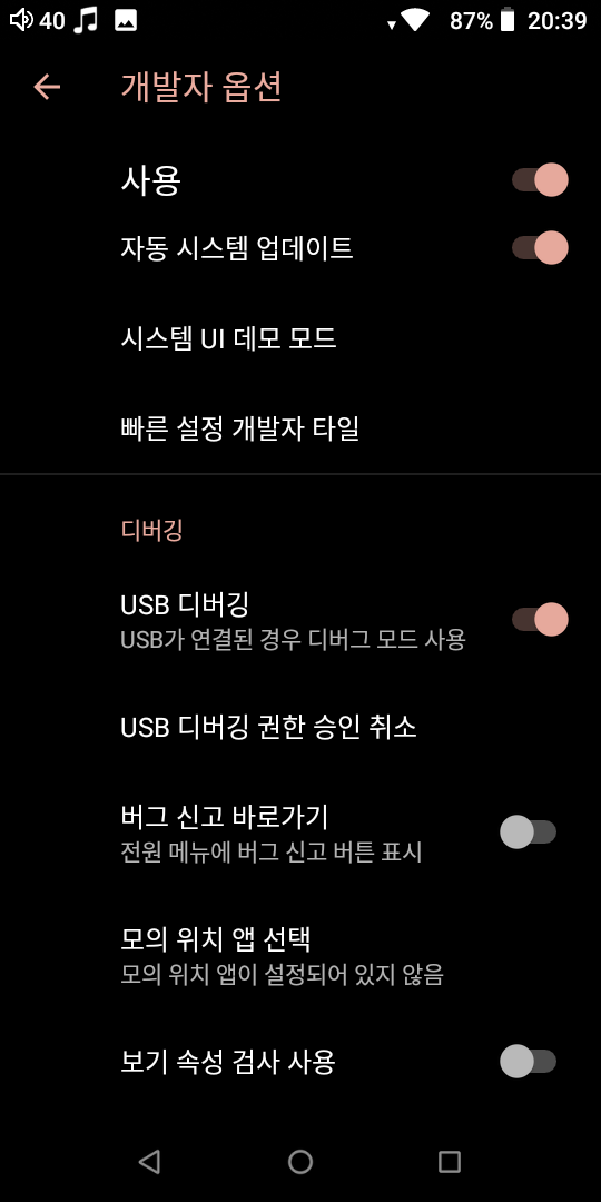 아래로 내리다 보면 USB 디버깅 메뉴가 보인다.