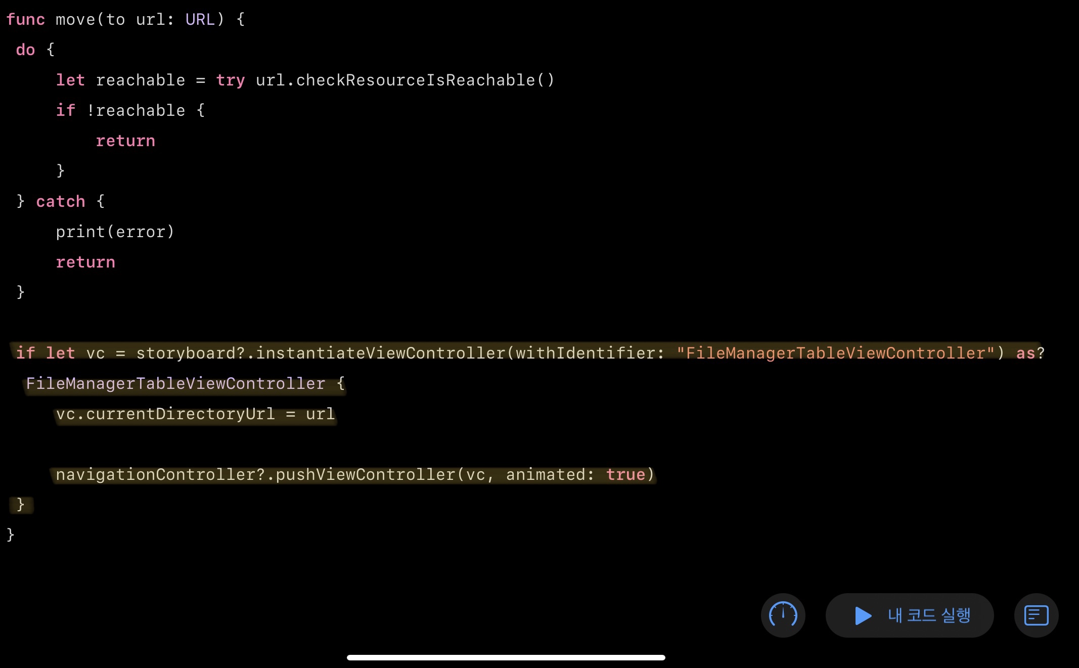 현재 URL에 해당하는 currentDirectoryUrl 변수에 전달 된 url을 저장하고, 이를 navigation Controller에 push한다.