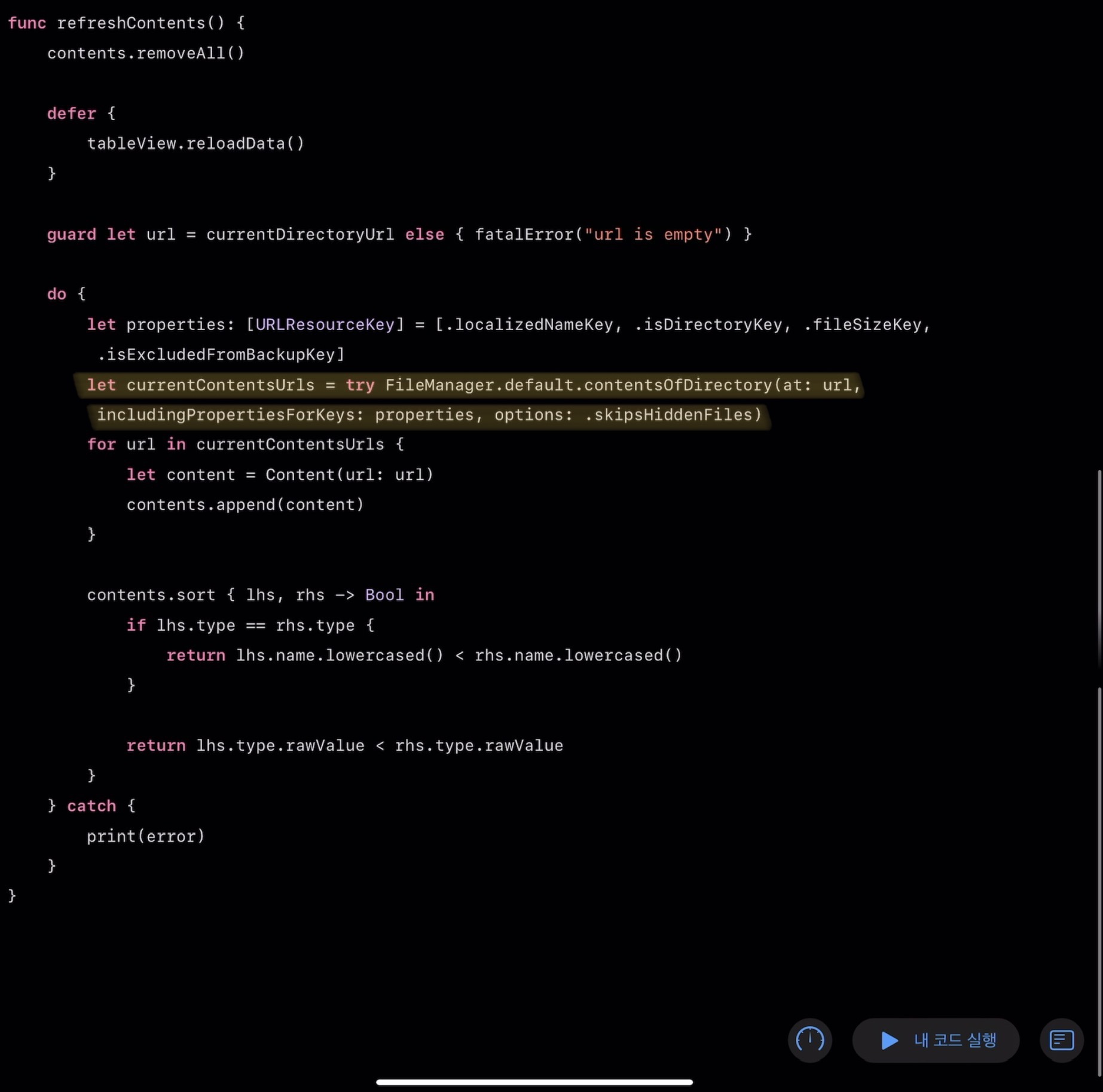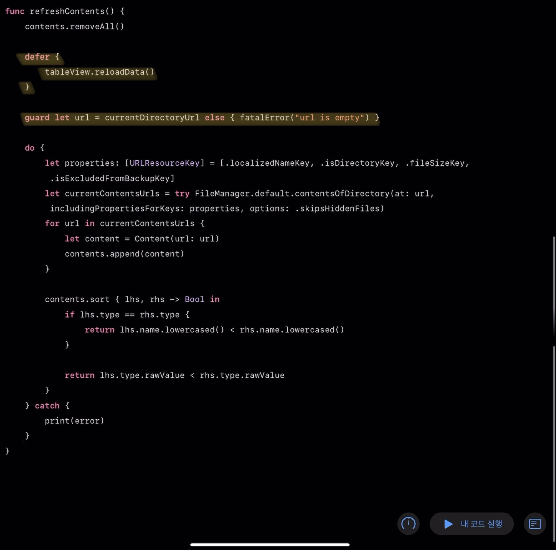 defer문을 사용해 refreshContents 메서드가 실행 완료 되면 tableView를 새로고침 하도록 한다.