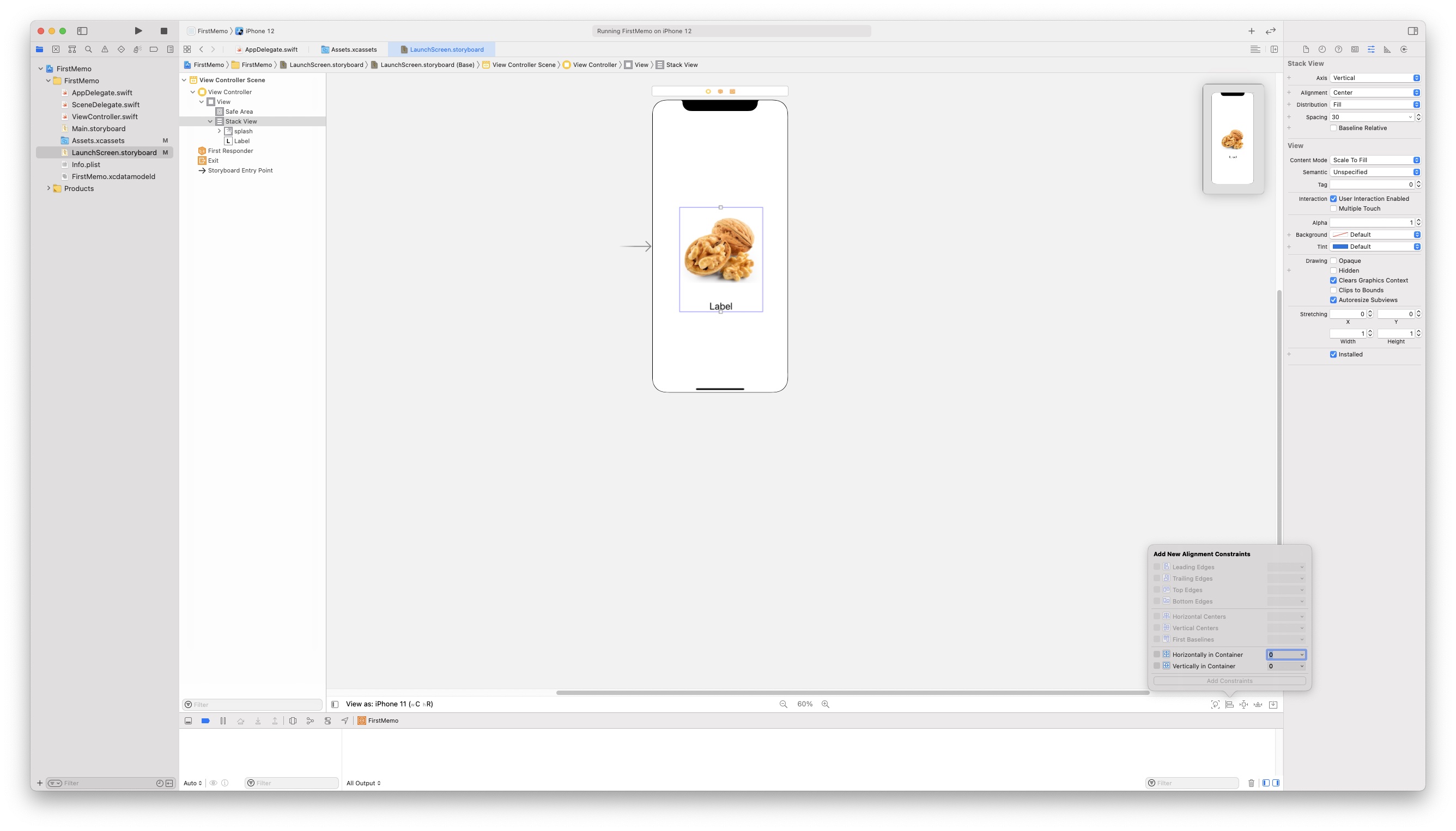 이후 Image View와 Label을 모두 선택한 후에 우측 하단의 Canvas Menu에서 Stack View를 선택해 준다.