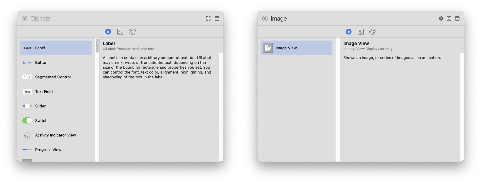 Xcode에선 이런 스토리보드에 Object(오브젝트)를 시각적으로 배치할 수 있도록 해 두었는데, 이러한 오브젝트를 선택하는 창을 Library(라이브러리)라고 한다.