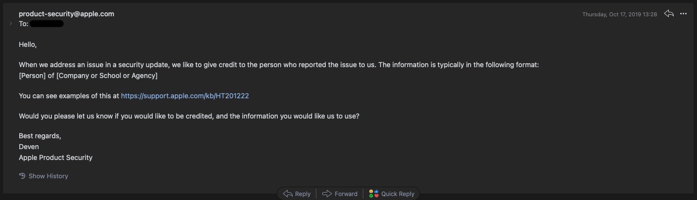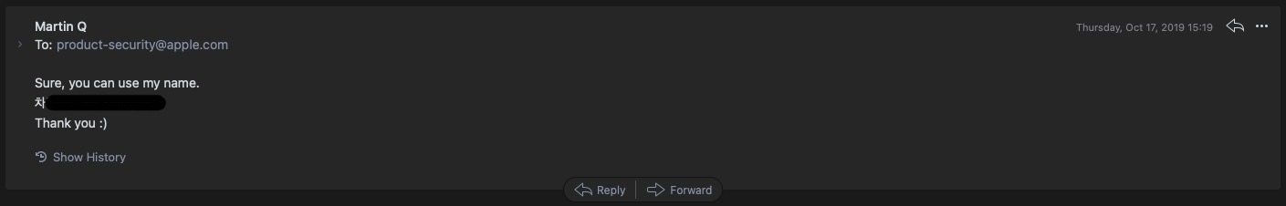 애플은 보안 업데이트에 착수한 경우 보고한 사람, 단체에 대해 명부를 작성하는 대우를 하고 있다는 메일이 도착했다.