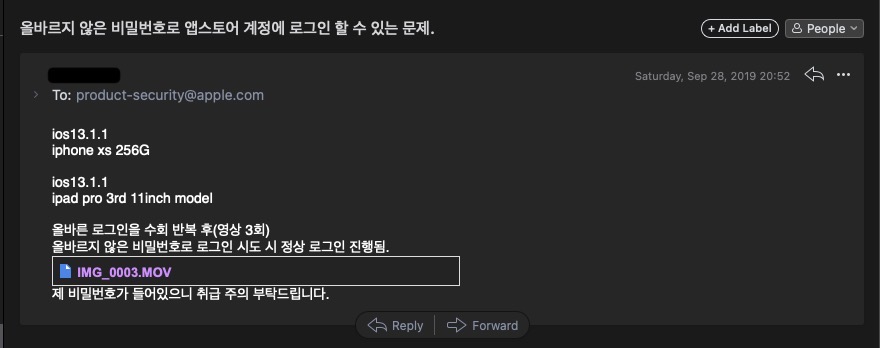 페이지의 내용을 읽어 보면 product-security@apple.com 주소로 해당 내용을 보내주길 안내하고 있고,