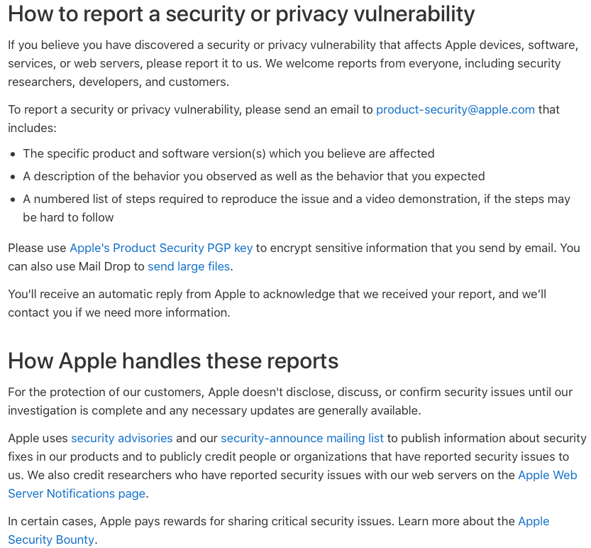 If you believe you have discovered a security or privacy vulnerability in an Apple product, please report it to us.