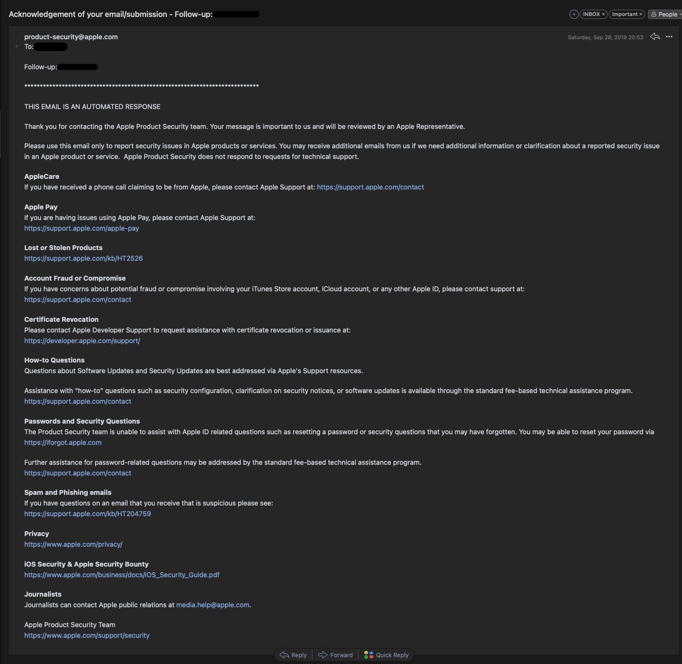 대부분의 기업들이 그렇듯, 애플도 제품과 보안 문제에 대한 피드백을 듣기 위해 연락처를 열어둔다.