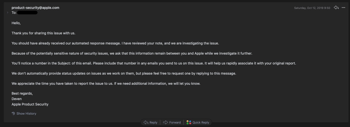 애플은 보안 업데이트에 착수한 경우 보고한 사람, 단체에 대해 명부를 작성하는 대우를 하고 있다는 메일이 도착했다.