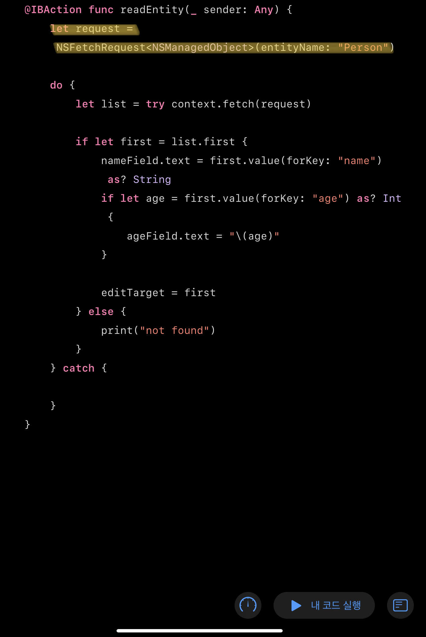 해당 변수에는 readEntity 메서드에서 Core Data를 읽은 다음,