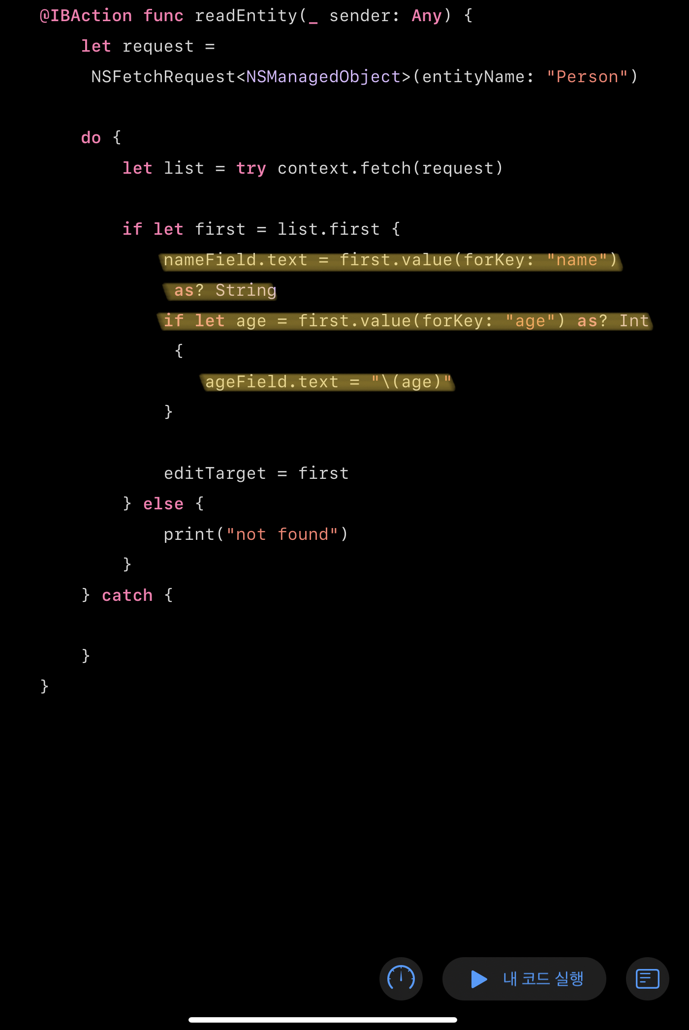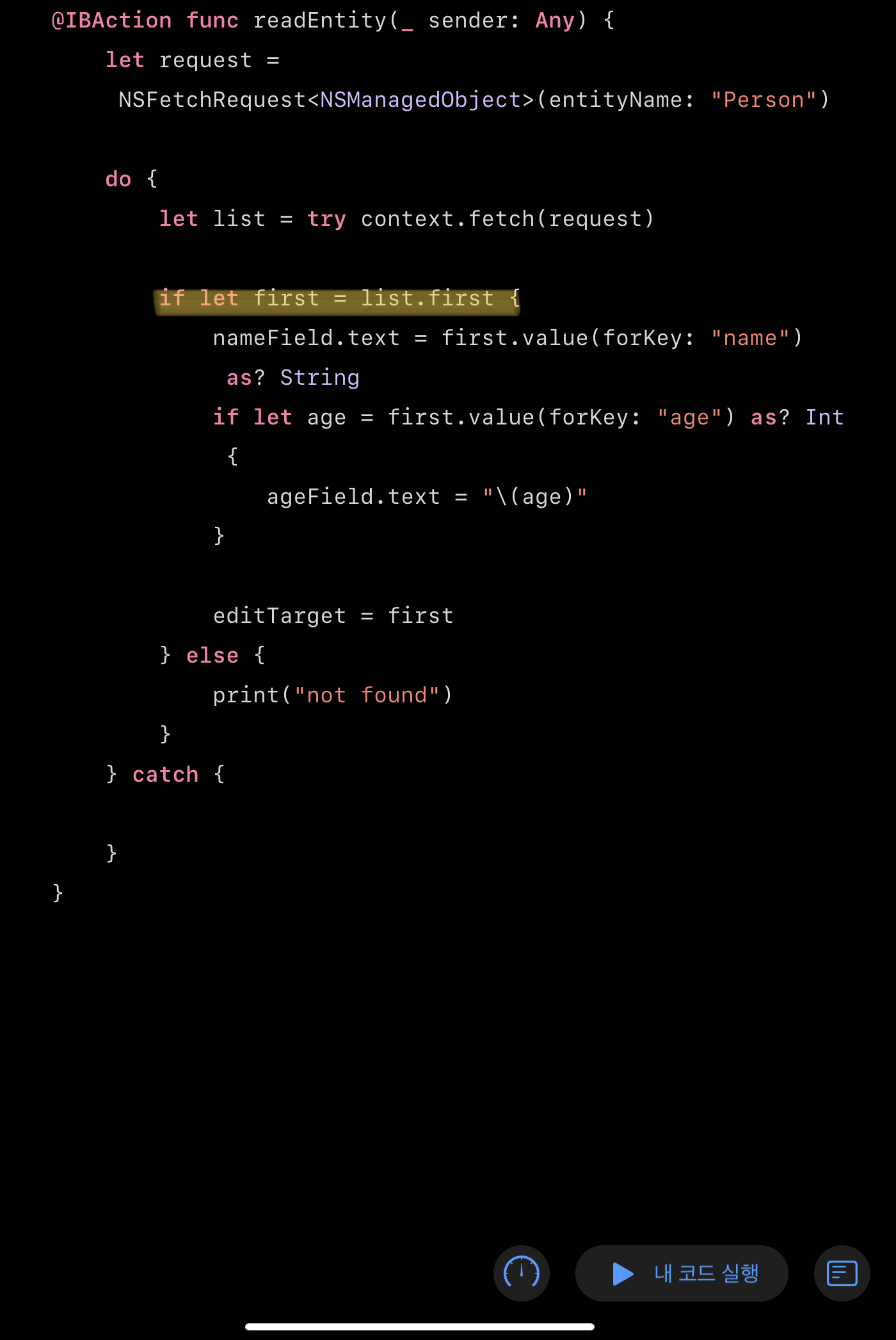 해당 변수에는 readEntity 메서드에서 Core Data를 읽은 다음,