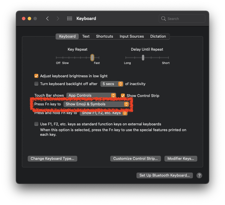 위의 화면으로 이동해서 'Press Fn Key to' 항목을 'Show Emoji & Symbols'로 변경한다.