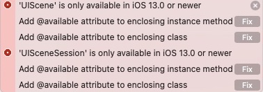 Fixit에서 'Add @available attribute to enclosing instance method'를 선택해 자동 수정할 수 있다.