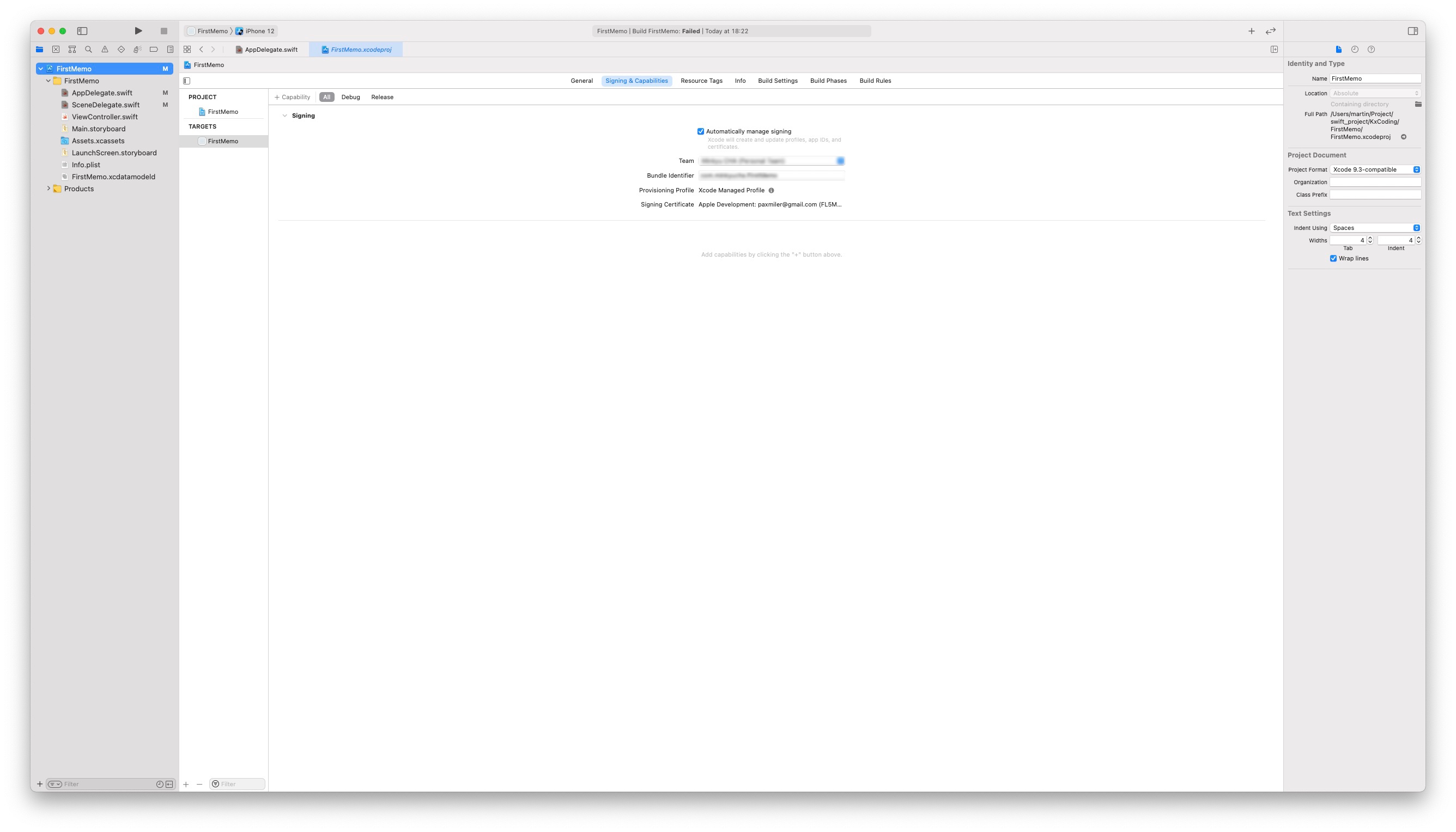 프로젝트 설정에는 Siging & Capabilities 가 존재한다.