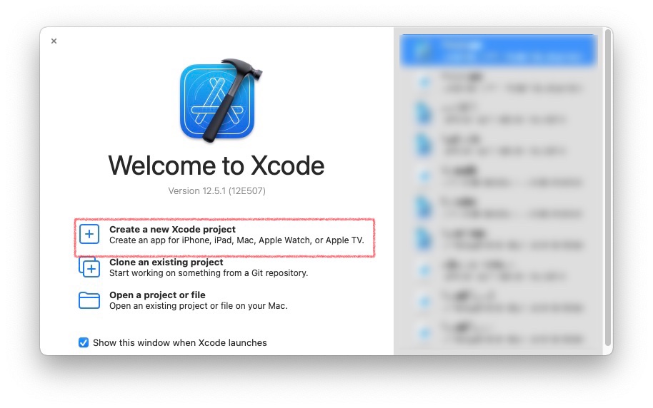 Xcode의 Welcome 화면에서 새 Xcode 프로젝트를 선택한다.