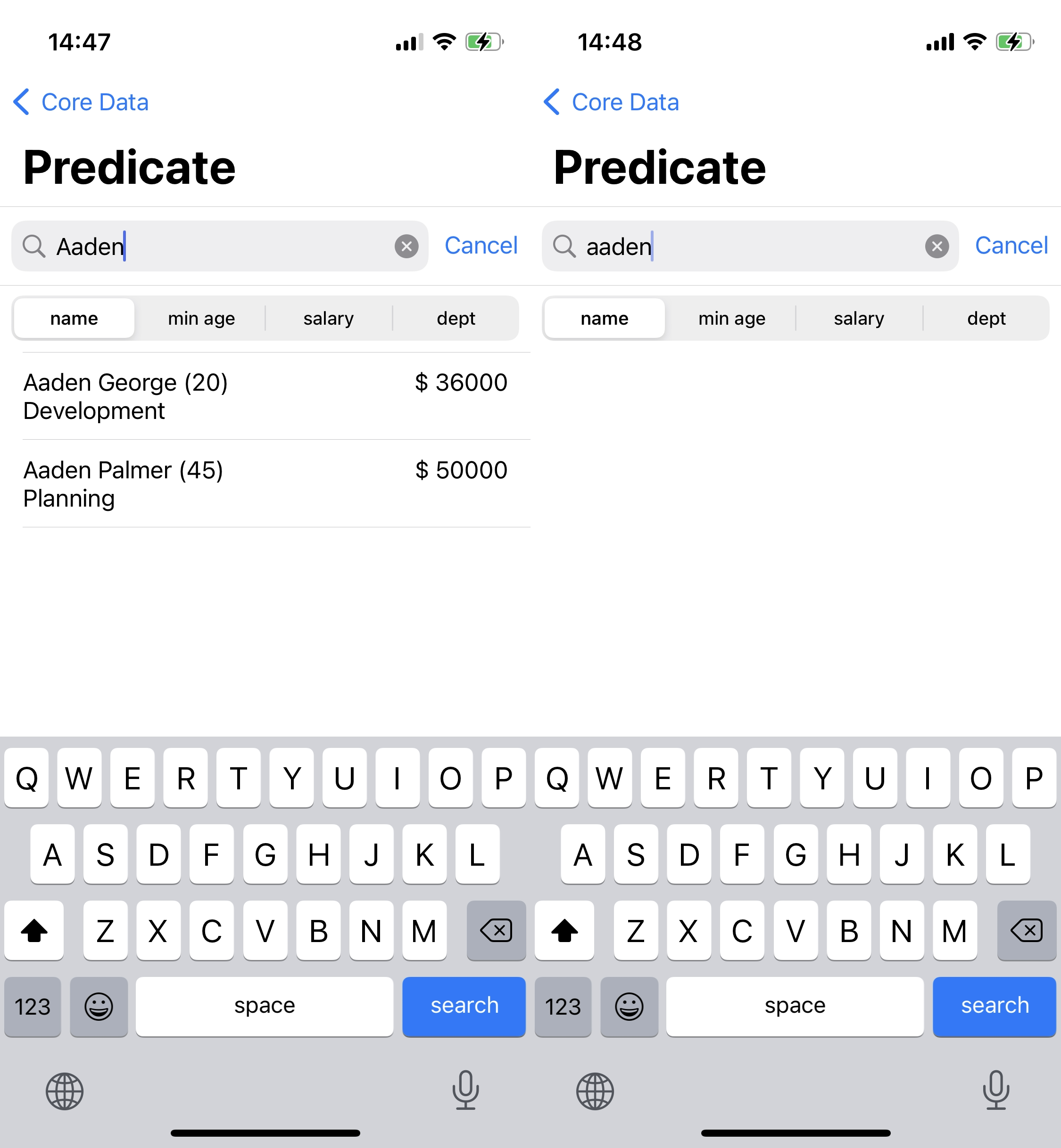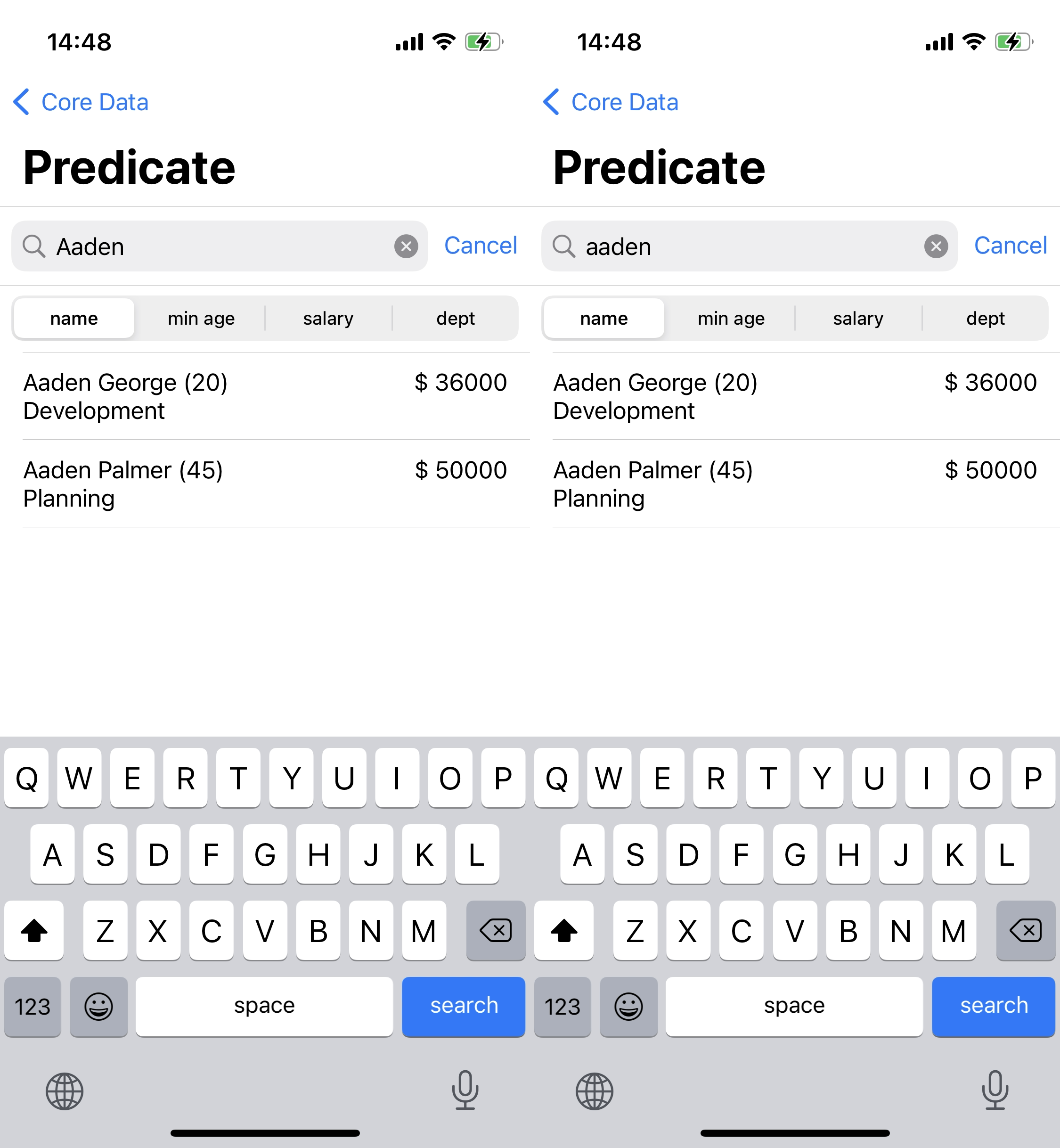 앞서 언급했듯 Predicate 문자열 자체는 대소문자를 구별하진 않지만 검색 자체에는 대소문자를 구별한다.