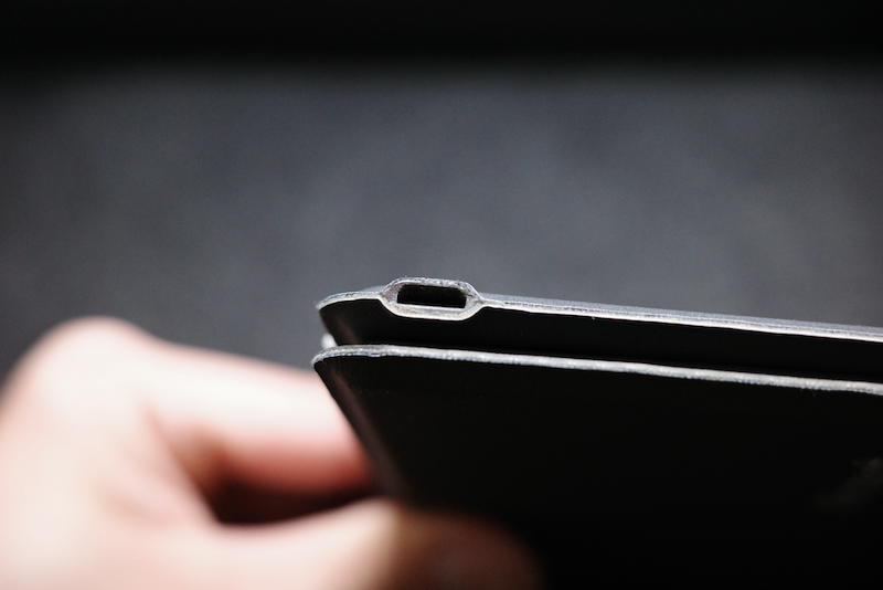 제품의 오른쪽에는 충전 포트가 있고, 접합 마감은 들뜸 없이 훌륭하다.