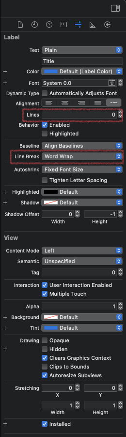 이후엔 컨텐츠를 표시할 셀의 Label을 선택하고, Attribute Inspector의 Lines를 '0'으로, Line Break을 'Word Wrap'으로 수정한다.