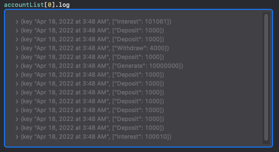 Python으로 작성했던 때와는 변화를 주기 위해 이자를 지급할 때도 로그를 남기도록 구혔했다.