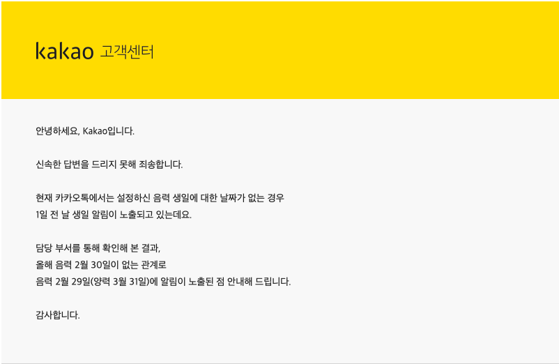 - '일자가 존재하지 않는 해에는 알림을 전달하지 않는다.'라고 답변하기 전에 관련 부서로 내용을 인계했어야 했다.