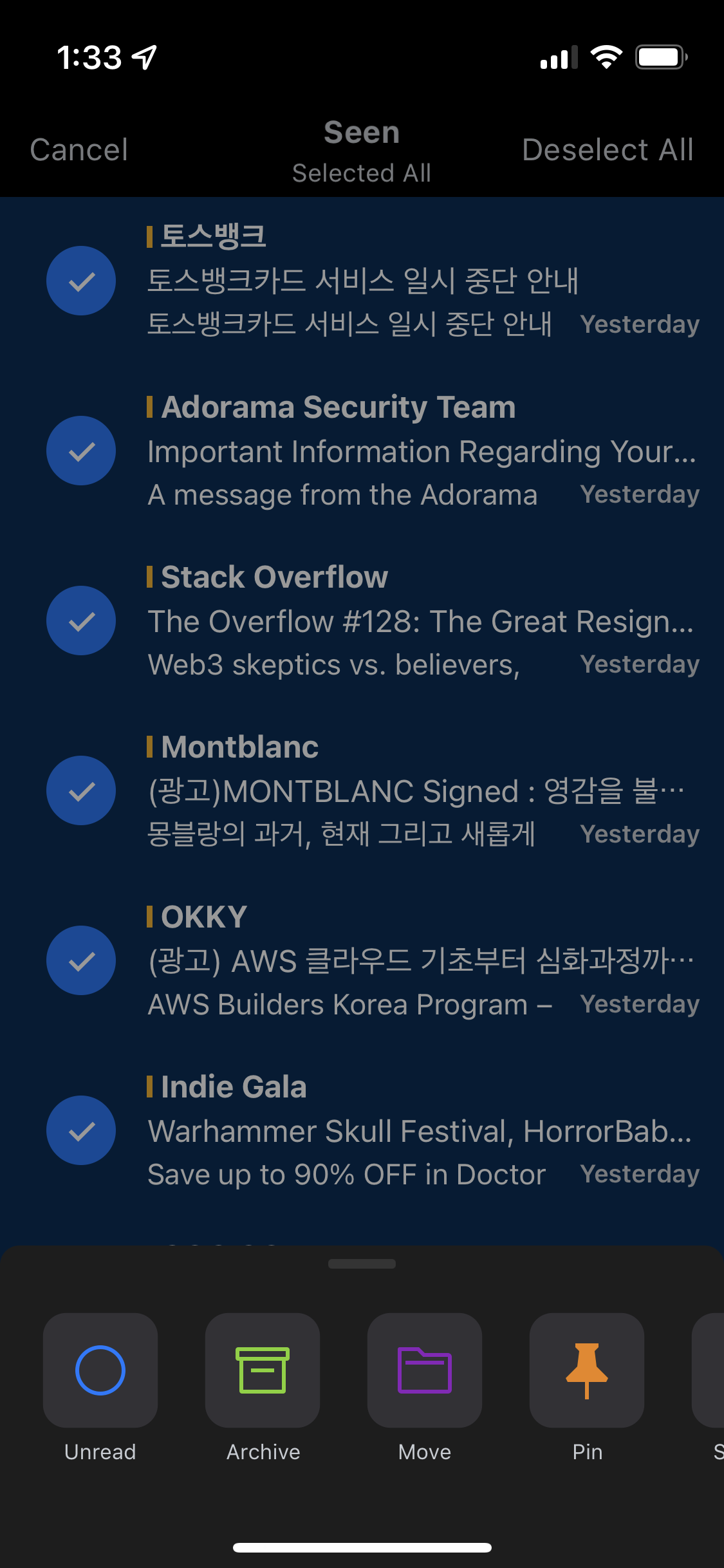 메일 앱이나 문자 앱 등에서 '일괄'로 처리하는 동작에 주로 이용되는 기술이다.