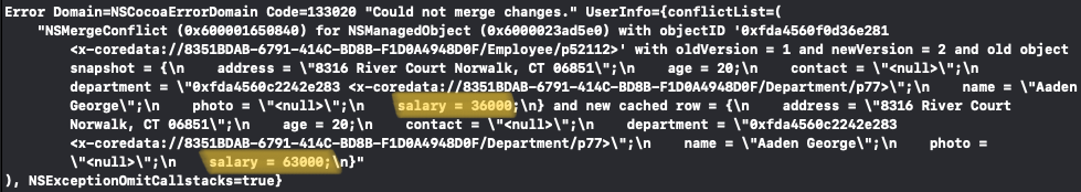 저장할 Attribute와 Snapshot이 충돌할 경우 저장소의 현재 값을 저장한다. - NSMergeByObjectStroreTrumpMergePolicy
