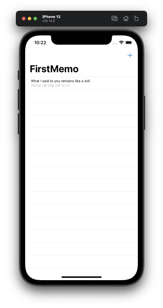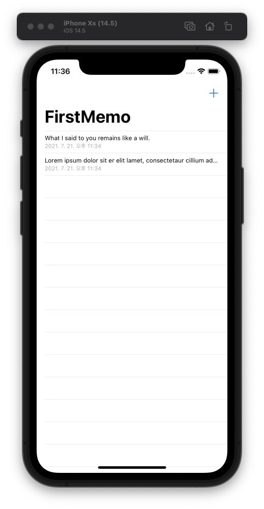 메모 작성 화면은 우측 상단의 '+'를 통해 새로운 화면으로 진입해야 한다.