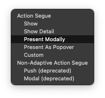 이 때 위와 같은 팝업이 열리는데, Present Modally를 선택한다.