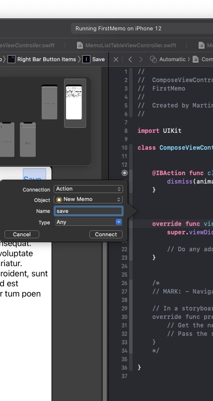 코드와 연결하고 싶은 버튼을 'Control + Drag'하여 코드 에디터의 원하는 위치로 끌어다 놓으면 된다.
