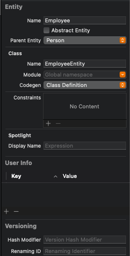 이후 Employee Entity의 Codegen 설정을 'Class Definition'으로 변경하고