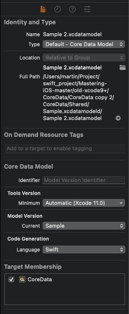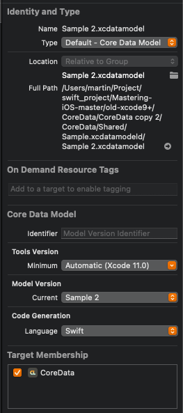 DataModel 파일을 선택하고 File Inspector에서 Current를 새로운 DataModel로 변경한다.