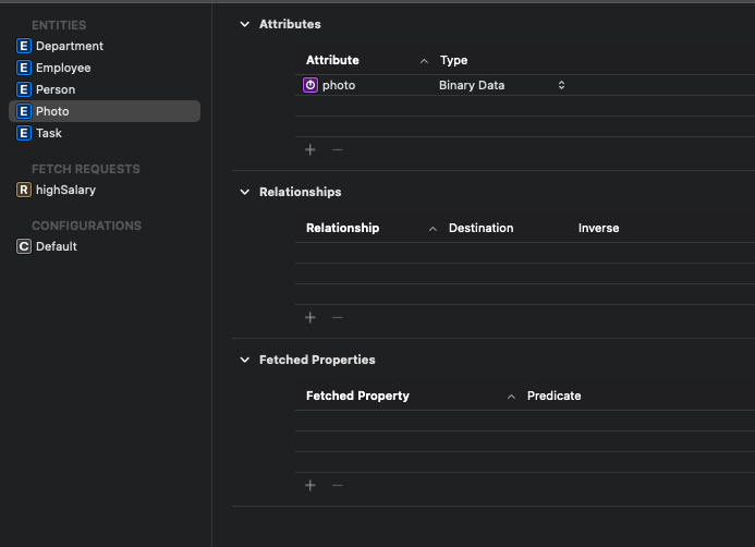 속성은 Binary Data, Optional, Allows External Storage를 사용하도록 설정한다.