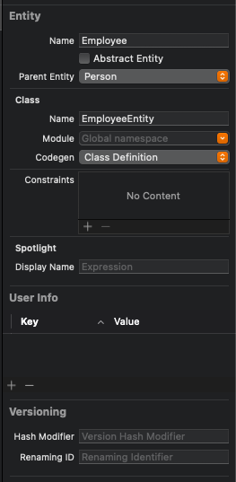 이후 Employee Entity의 Codegen 설정을 'Class Definition'으로 변경하고