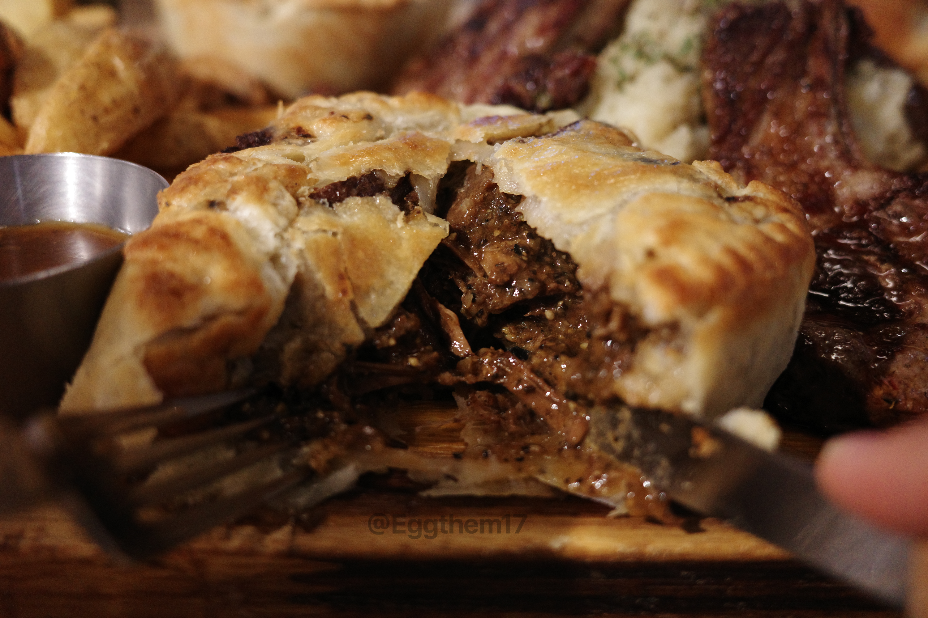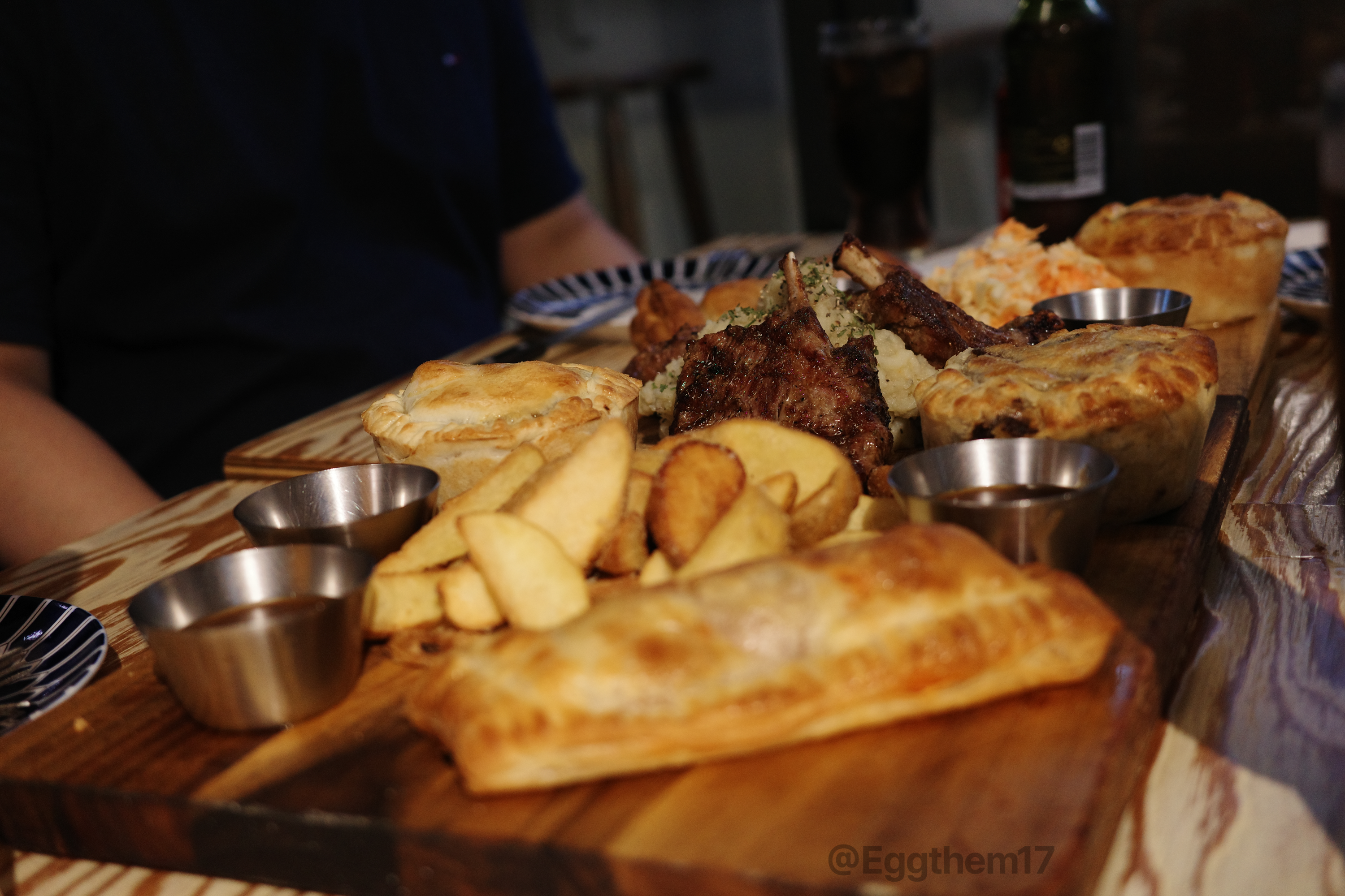 주문한 건 Ridiculous : Lamb pie, Pepper steak pie, Bobotie pie, Traditional, Chorizo, Slaw, Fires, Mesh Potatoes