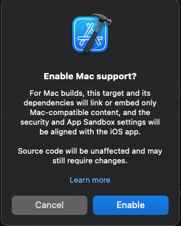 프로젝트 설정에서 Deployment Info > Target 에서 'Mac'을 선택하는 것으로 Mac Catalyst를 사용할 수 있다.