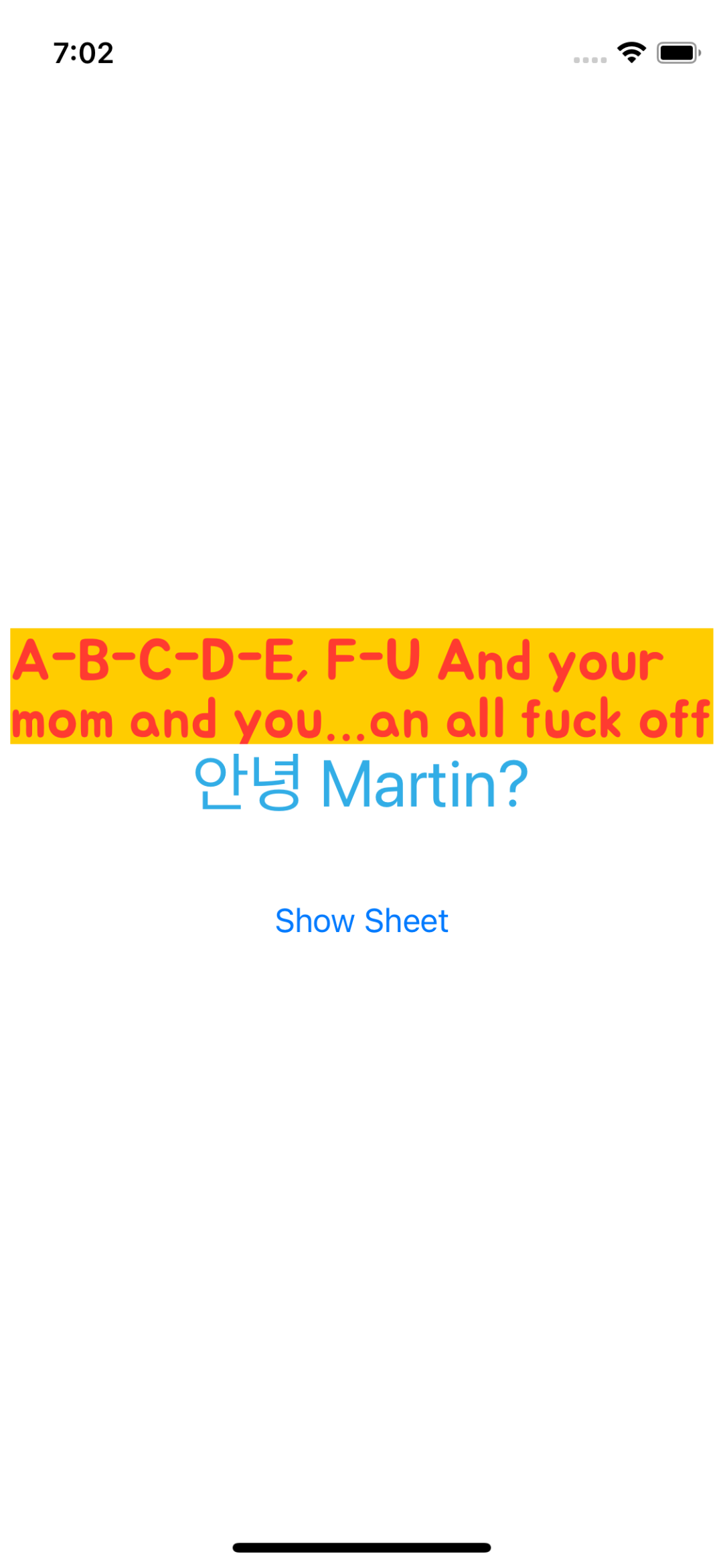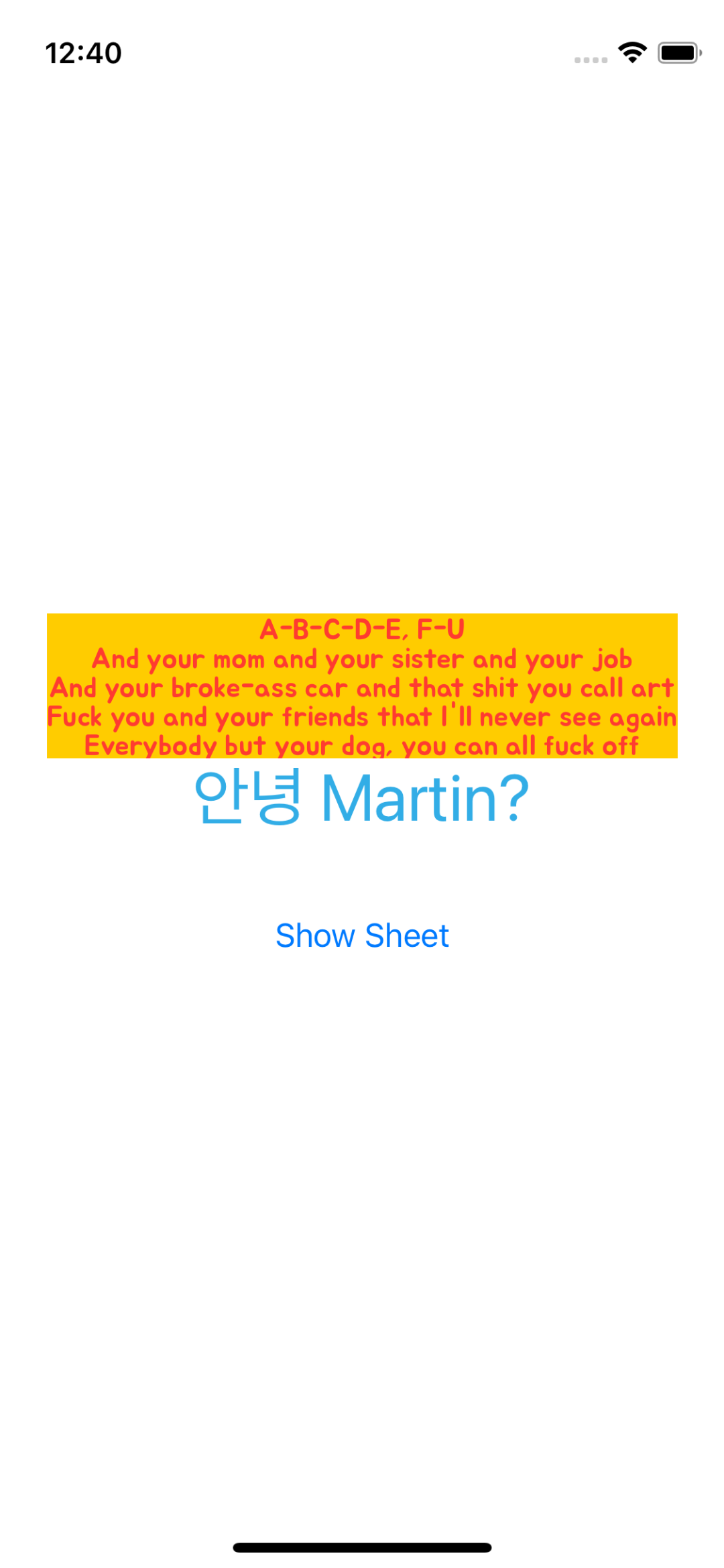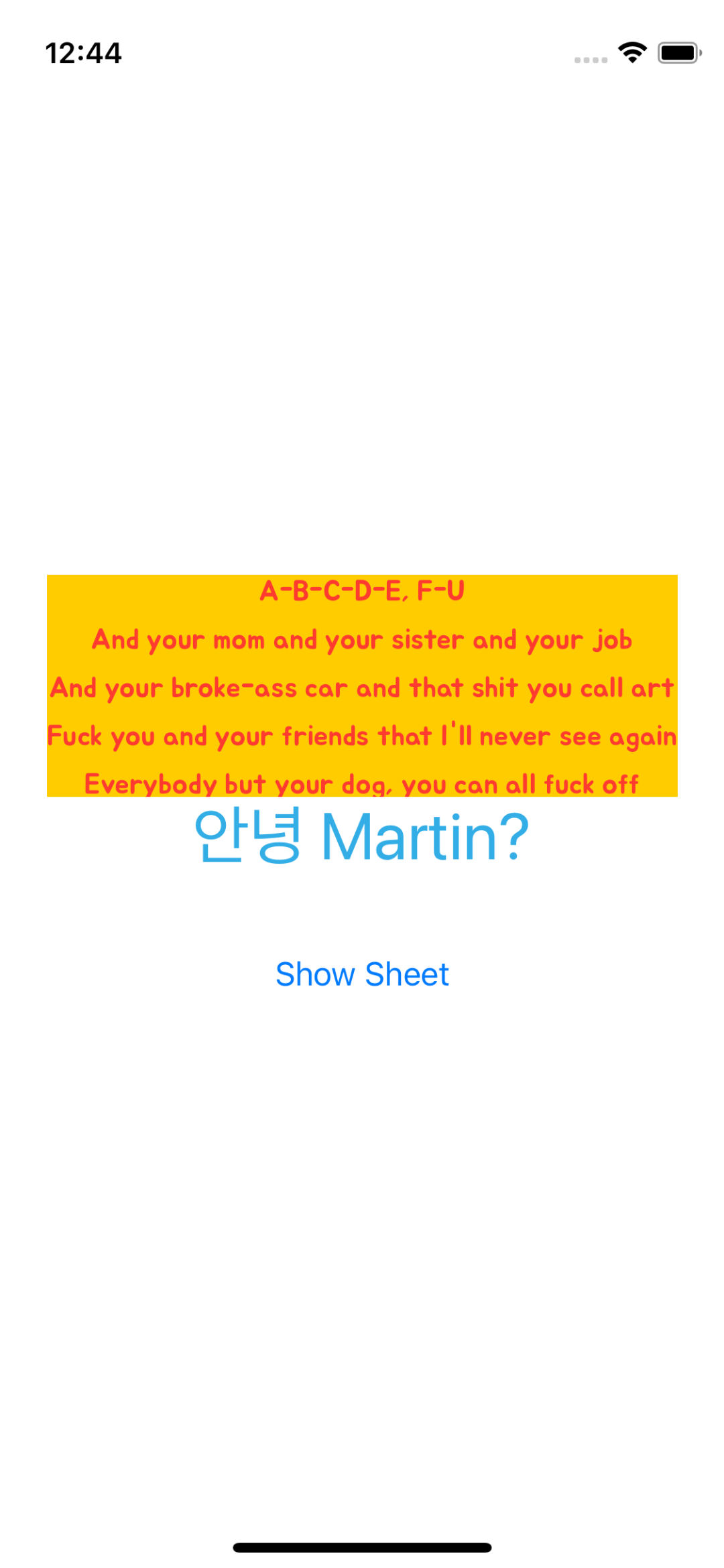 @State private var statusMessage = "A-B-C-D-E, F-U And your mom and your sister and your job And your broke-ass car and that shit you call art Fuck you and your friends that I'll never see again Everybody but your dog, you can all fuck off"