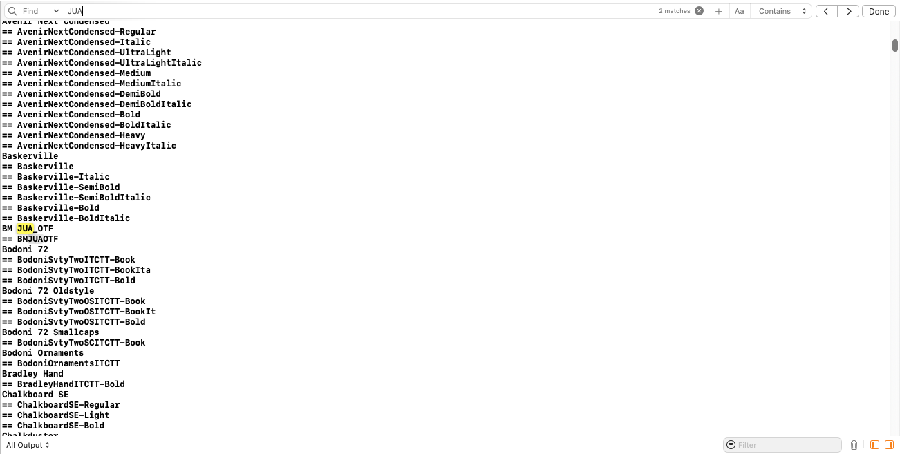 콘솔을 확인해 보면 추가한 폰트는 'BM HUA_OTF' 혹은 'BMJUAOTF'로 사용할 수 있는 모양이다.