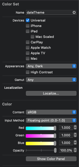 이후 해당하는 ColorWell을 선택하고, Show Color Panel이나 기타 방법들로 원하는 색을 채워 넣는다.