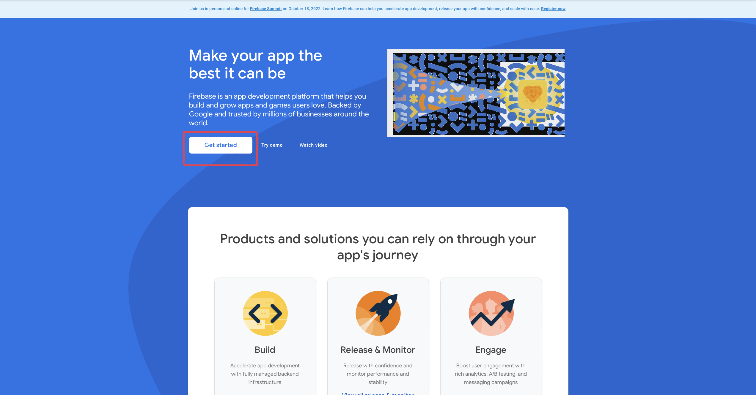 Firebase에 회원가입을 하고, 'Get started'를 선택한다.