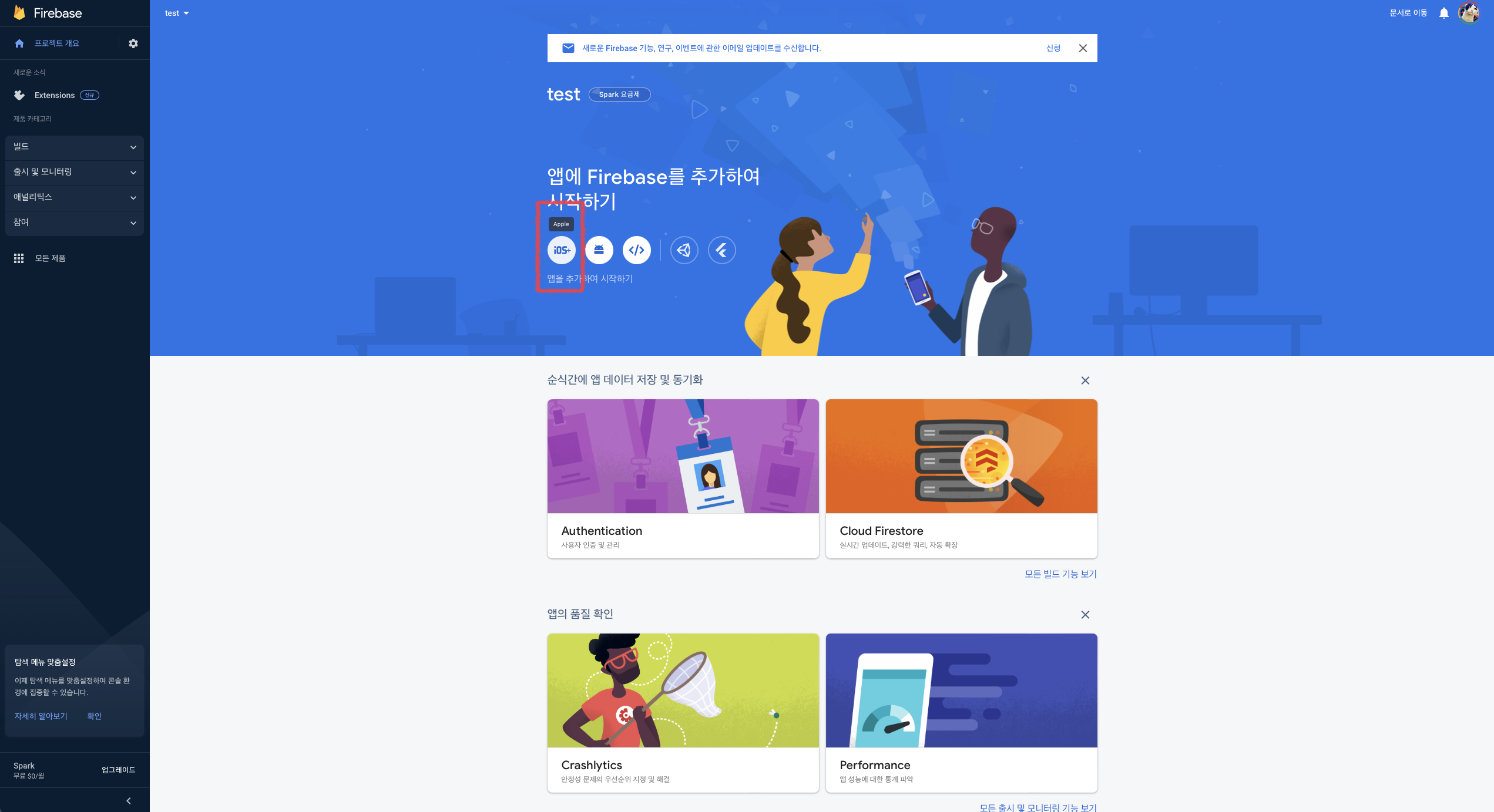 생성된 프로젝트의 Console로 이동해 표시된 'iOS' 버튼을 선택한다.