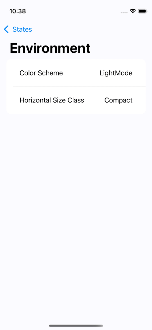 시스템에서 제공하는 공유 데이터인 colorScheme과 horizontalSizeClass를 표시하도록 구성했다.