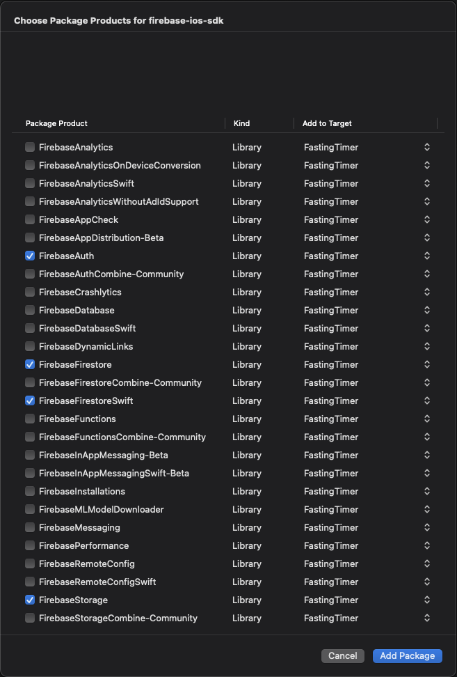 회원가입과 로그인 기능을 위한 'FirebaseAuth', DB 접근을 위한 'FirebaseFirestore'와 'FirebaseFirestoreSwift',