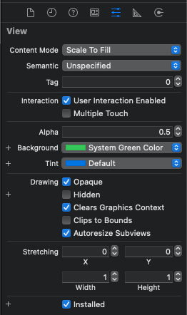 우선 SubView인 초록색 UIView의 알파를 0.5로 변경하면 위와 같이 해당 뷰의 투명도만 변경되는 것을 알 수 있다.