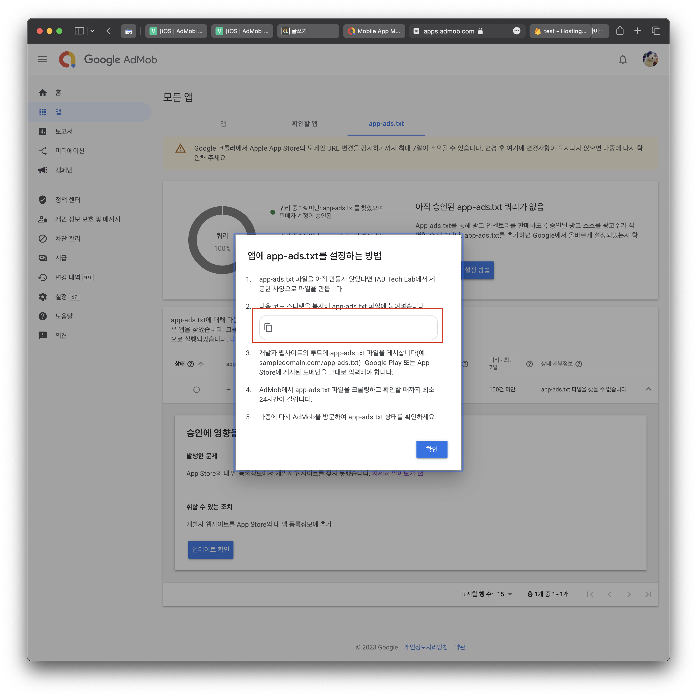 admob console의 '모든 앱 > app-ads.txt'로 이동하면 설정하는 방법을 안내해 준다.