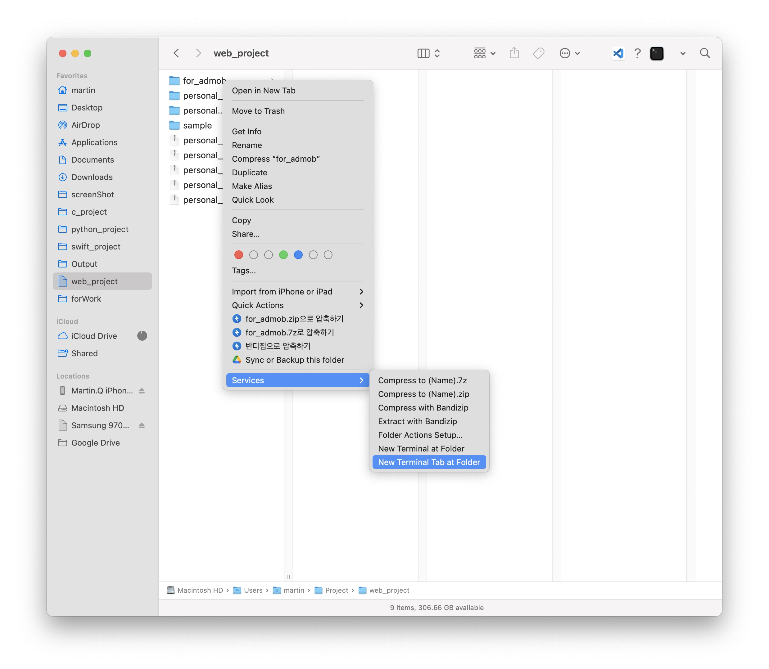 프로젝트를 생성할 폴더를 하나 생성한 후, '우클릭 > Services > New Terminal Tab at Folder'를 선택한다.
