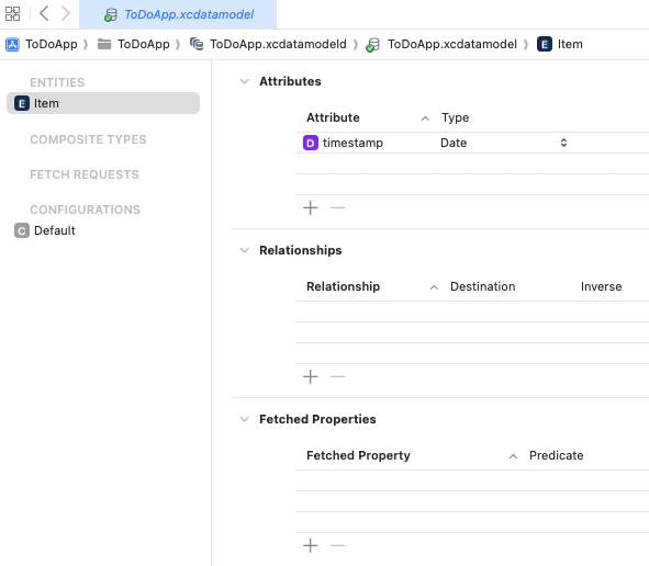 CoreData를 사용하기 위해 Environment 프로퍼티를 추가하고, 정렬과 검색에 사용하기 위한 Date 형식의 변수도 추가한다.
