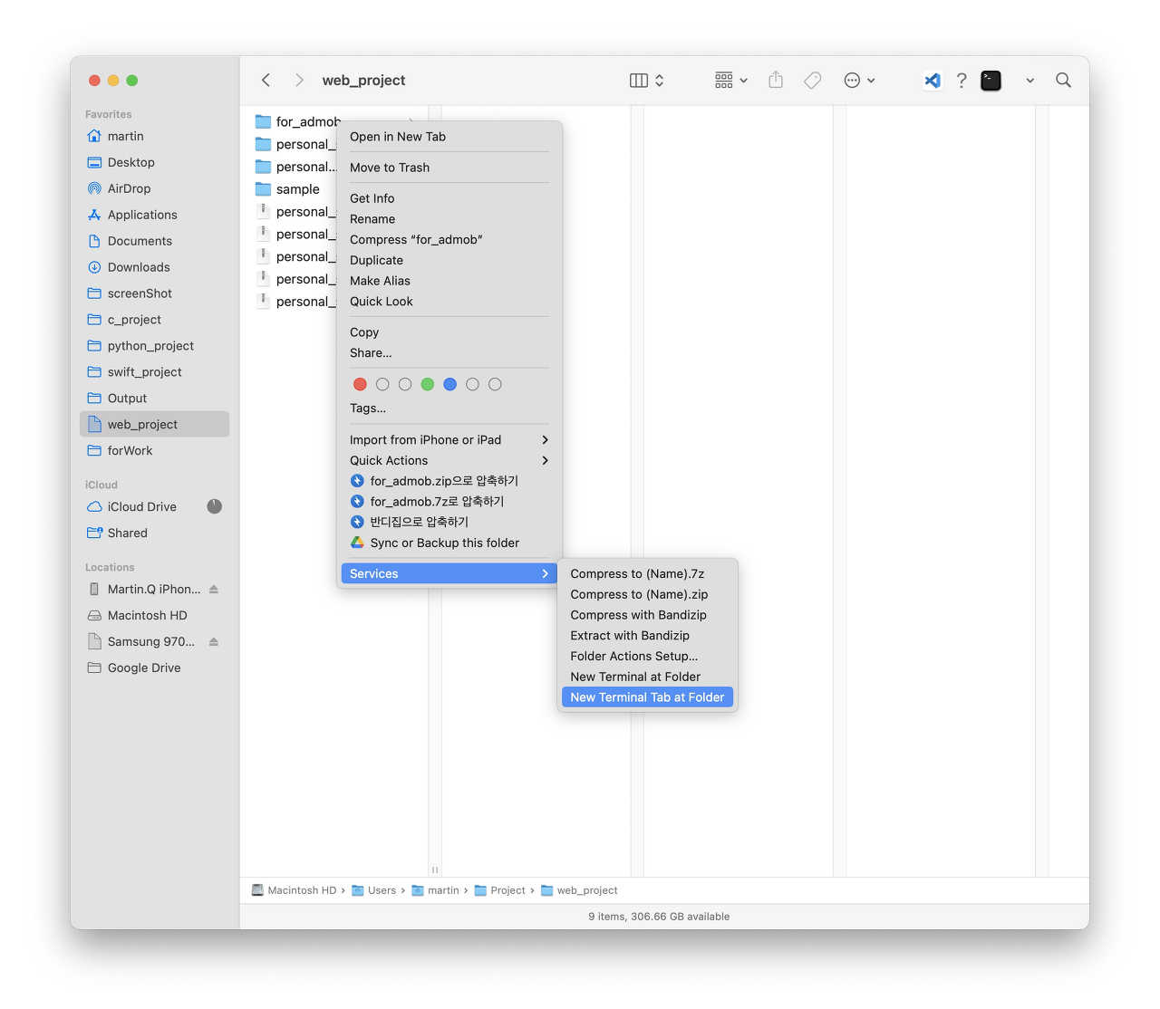 알겠지만 프로젝트 폴더에 우클릭해서 쉽게 해당 경로의 터미널을 열 수 있다.