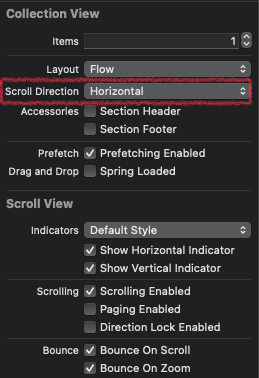 ViewController에 CollectionView를 하나 추가하고, Scroll Direction을 Horizontal로 변경한다.