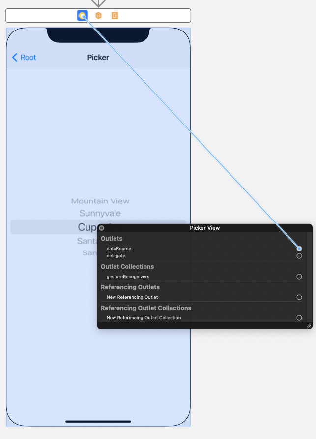 Action으로 연결 된 메서드는 @IBAction 특성이 붙고, gutter 영역에 연결 여부를 표시하는 Connection Well이 표시된다.